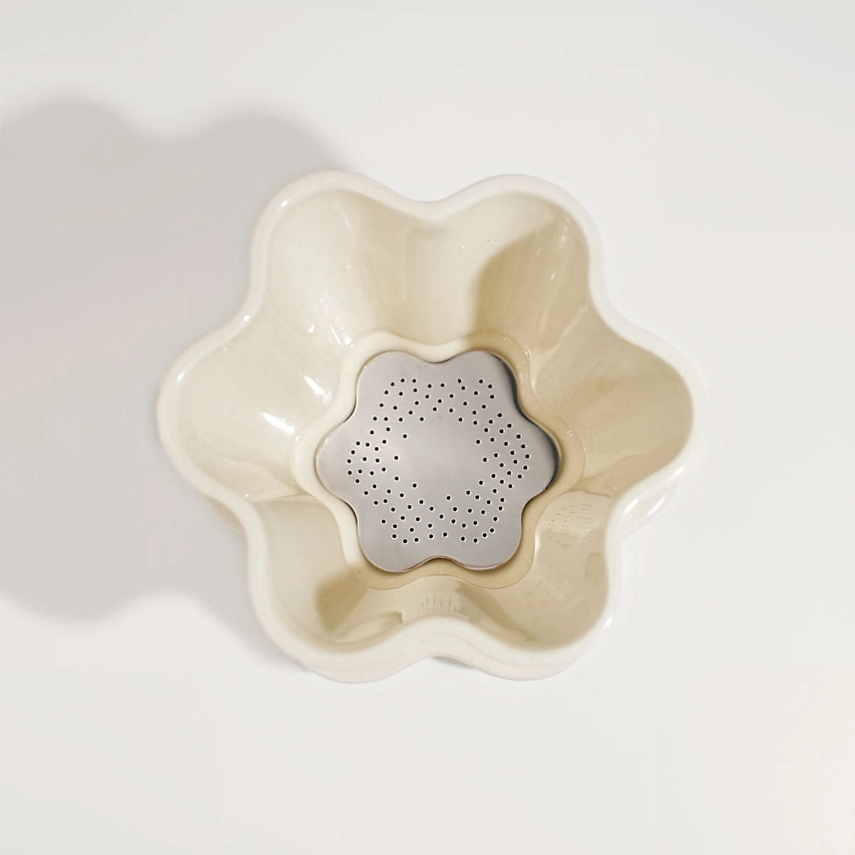 Cedzak w kolorze słomkowym tj. kremowo-beżowy kolor z drobinkami i błyszczące szkliwo (bez spodu cedzaka).