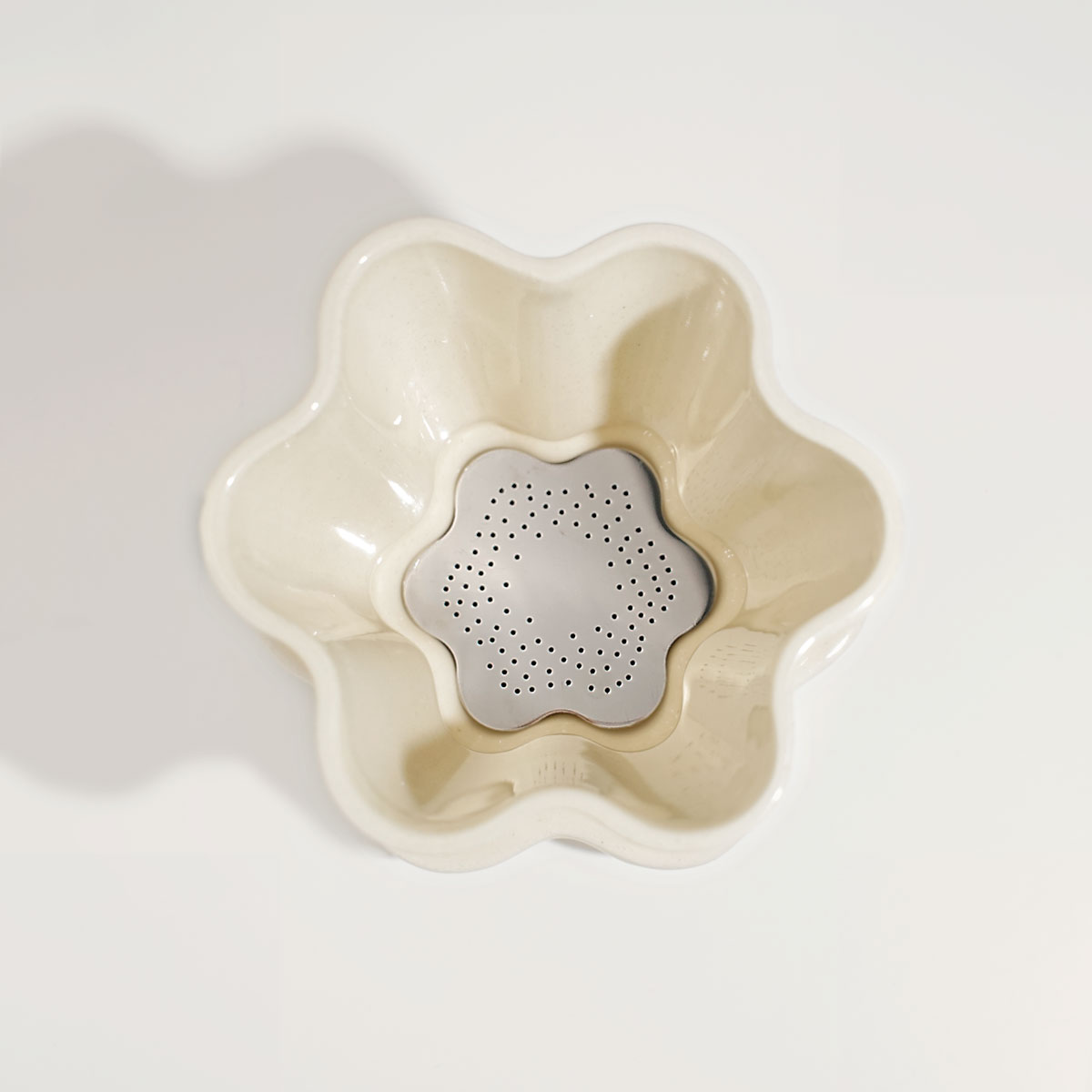 Cedzak składa się z 2 elementów: ceramicznego, szkliwionego lejka oraz sitka ze stali nierdzewnej.
